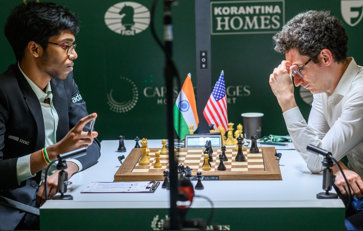Caruana managed to obtain a small initiative, highlighted by a strong knight planted on d3, yet the Indian grandmaster neutralized all threats efficiently and secured a solid draw.