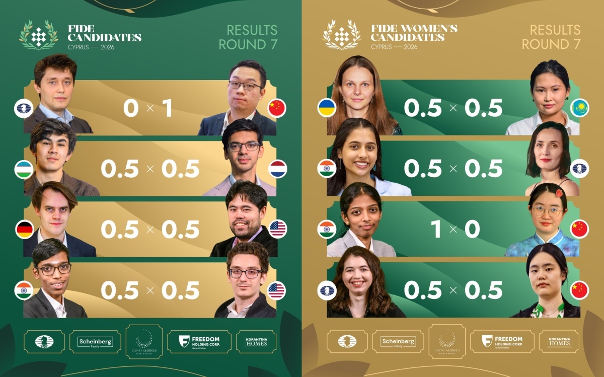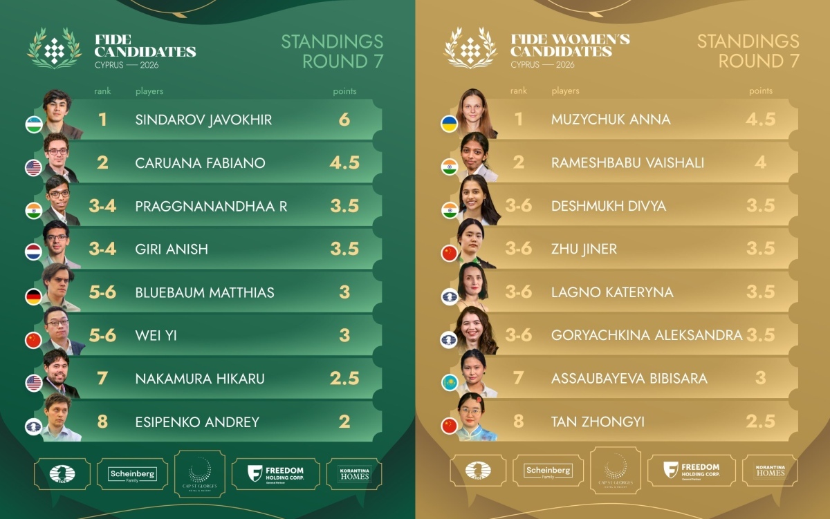 In the Women’s FIDE Candidates, Vaishali defeated Tan Zhongyi and now sits just a half-point behind Anna Muzychuk, who continues to lead the standings with 4½/7.