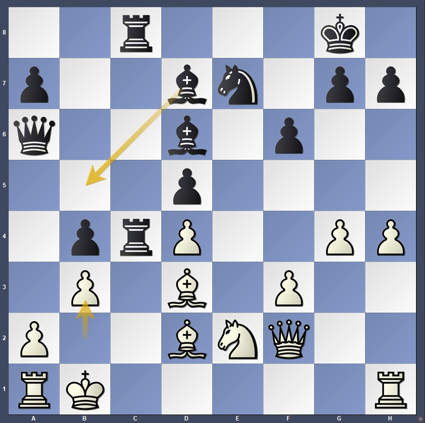 At this moment, Black is practically playing with an extra rook due to the terrible placement of White’s rook on a1. The key question: how to break through?