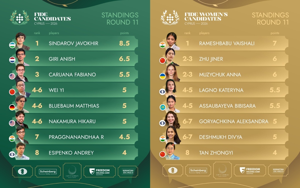 In the women’s section, Vaishali R scored a crucial win with the black pieces over Aleksandra Goryachkina, moving a full point ahead of the field and taking clear control heading into the final rounds.