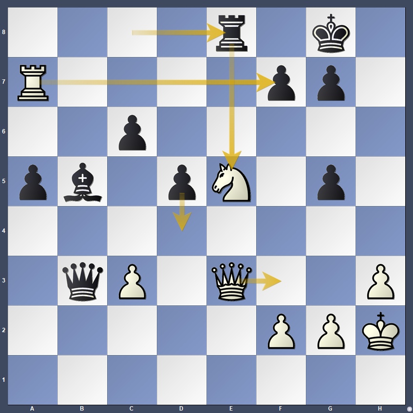 Instead, the decisive continuation was: 34.Rxf7! with strong attacking ideas, including the threat of 35.Qxg5 and mating patterns on g7.