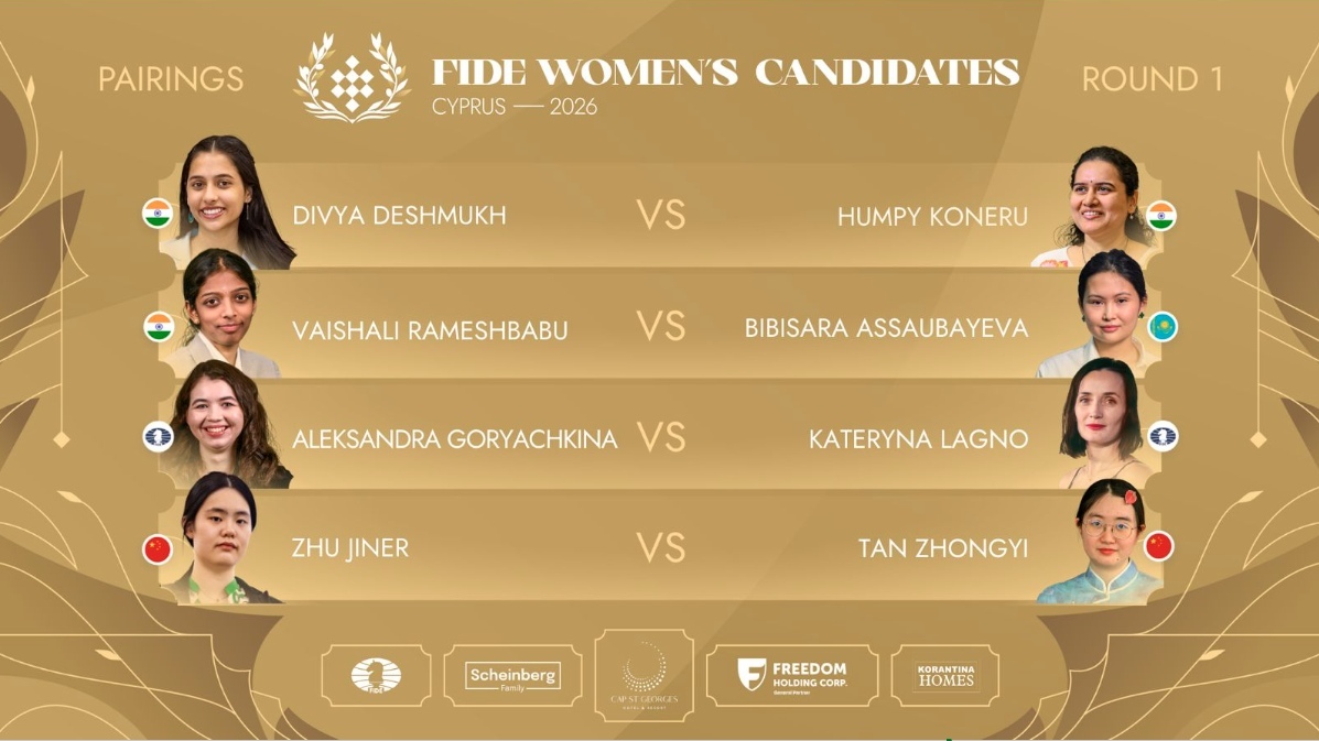 The first round in the FIDE Women’s Candidates also presents several top-level encounters, many featuring players from the same federation. Zhu Jiner faces former Women’s World Champion Tan Zhongyi, Aleksandra Goryachkina meets long-time rival Kateryna Lagno, and Vaishali R takes on Bibisara Assaubayeva in a matchup between two of the youngest players in the field. The round is completed by the meeting between Humpy Koneru and Divya Deshmukh, pairing one of the most experienced players in the tournament with one of its newest participants.